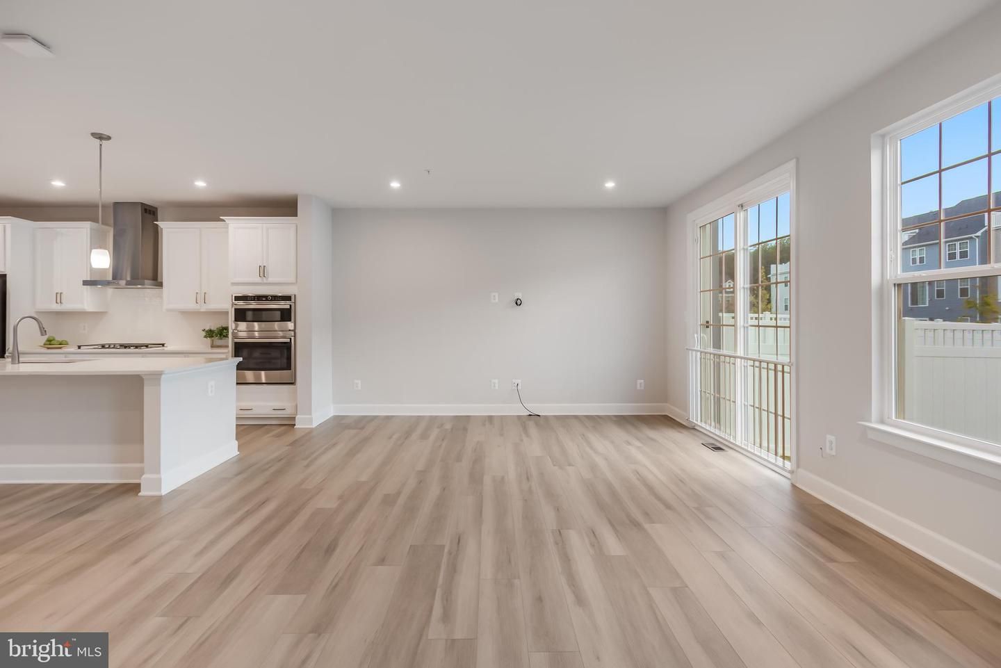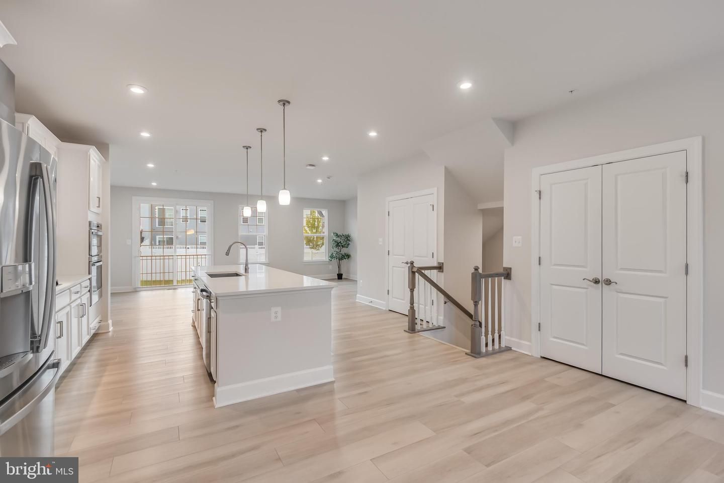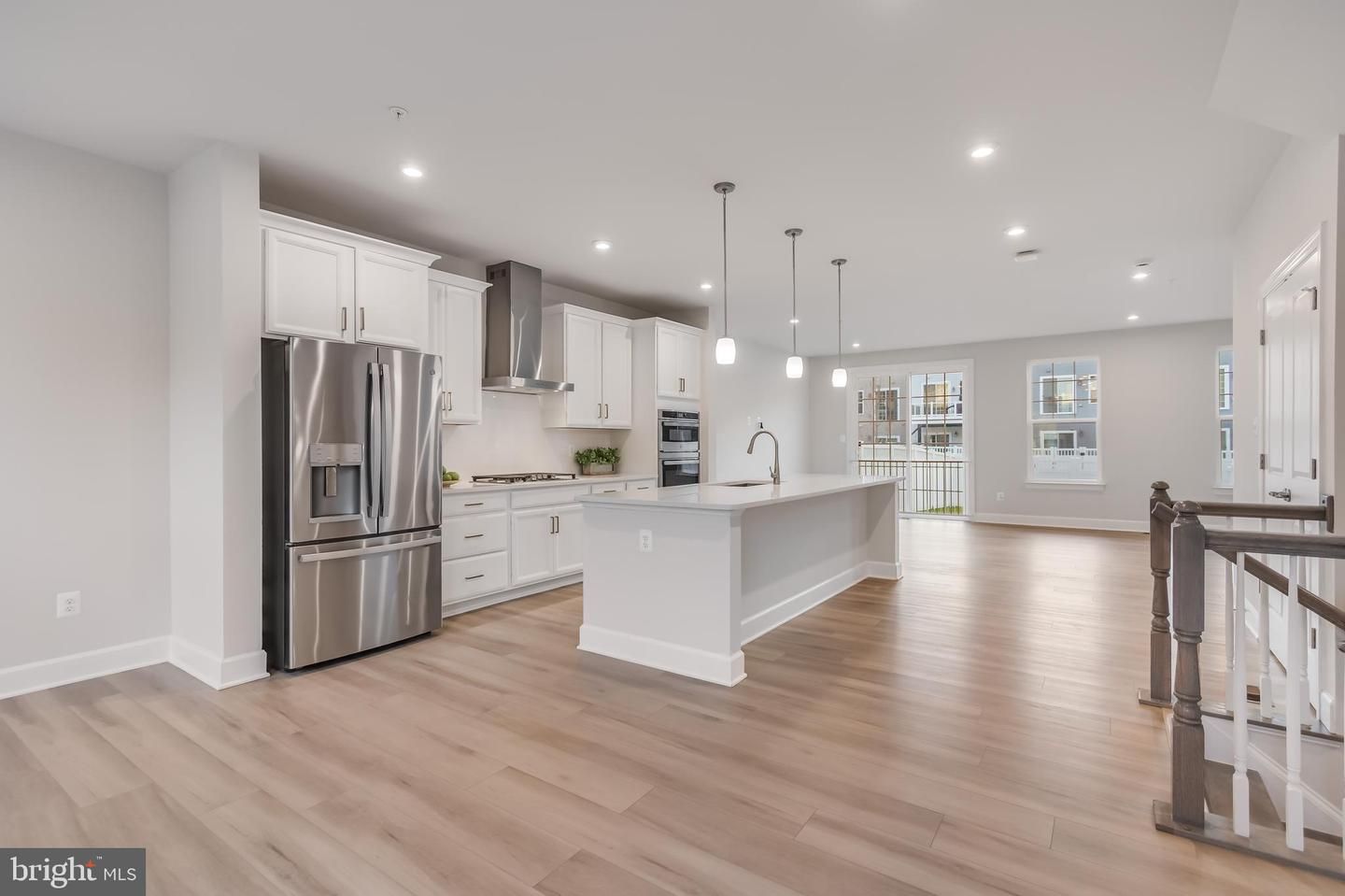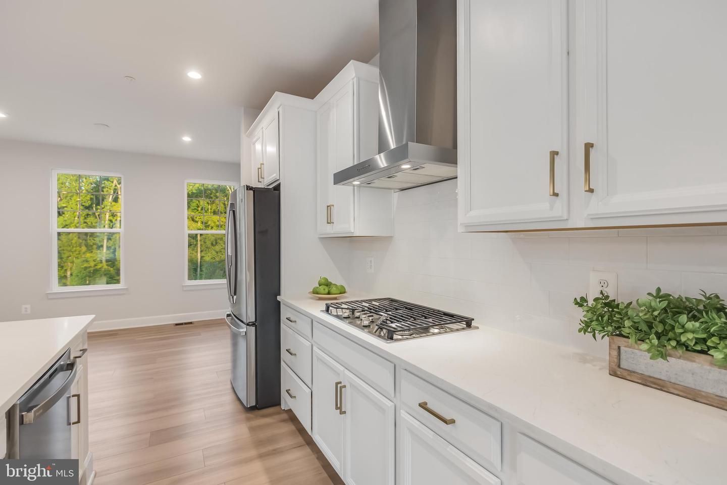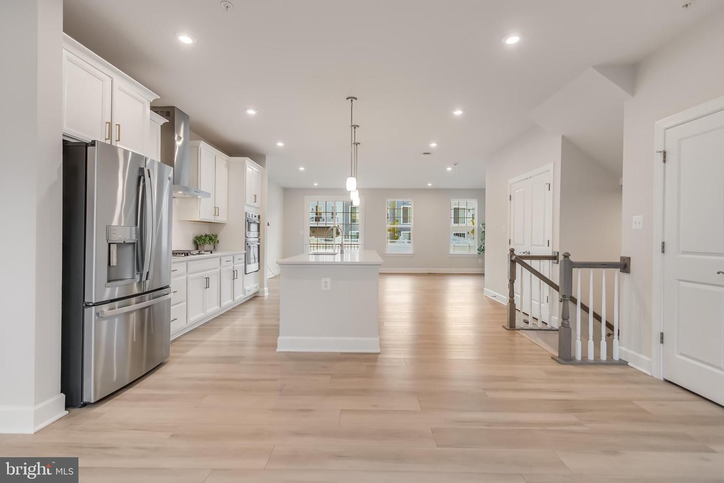 Step inside to discover luxury vinyl flooring flowing seamlessly through the main areas, creating a sleek and timeless look, while plush carpet in the bedrooms adds a layer of comfort. The open-concept main level is light-filled and inviting, anchored by a chef’s kitchen with striking white cabinetry, gleaming quartz countertops, and brass fixtures. Culinary enthusiasts will appreciate the stainless-steel appliances, including a gas range with stainless range hood, double ovens, and a large refrigerator—making both everyday cooking and entertaining effortless.