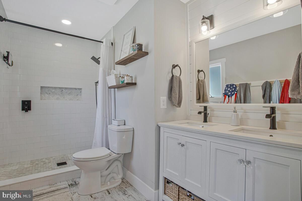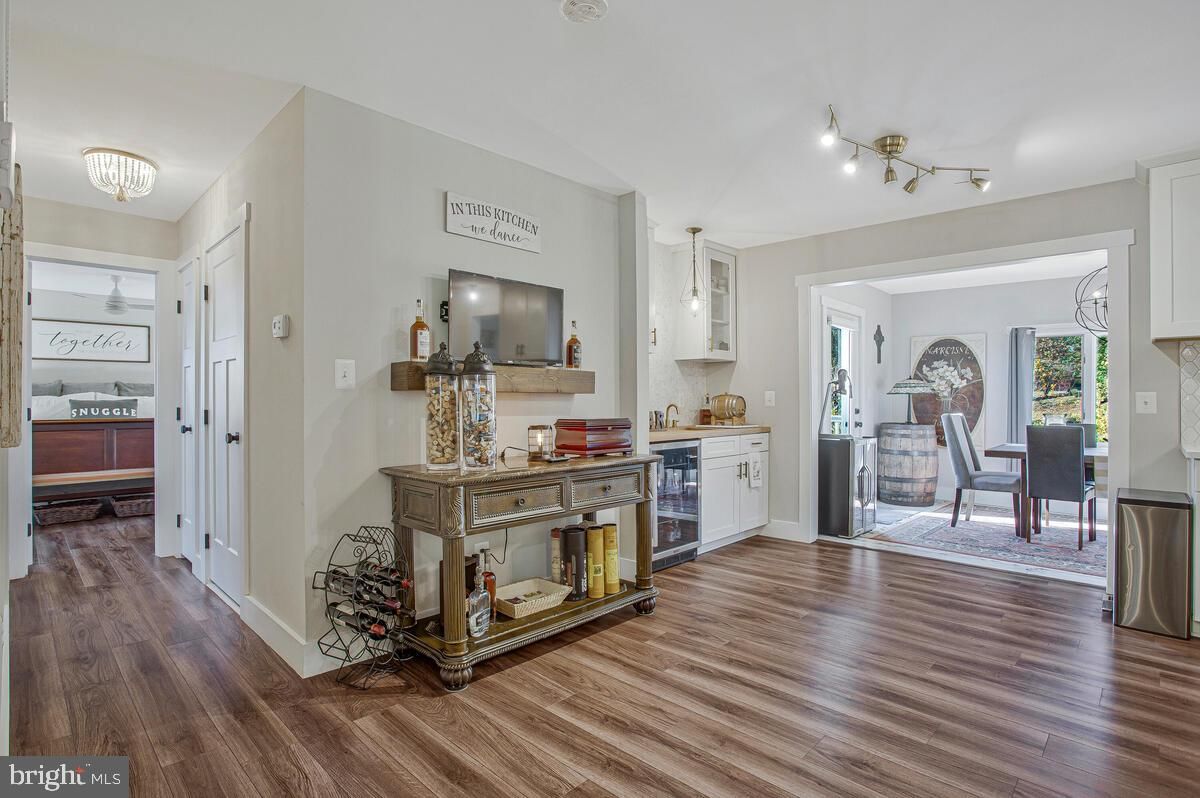 A Diamond in Dunkirk! This updated rambler perfectly blends modern style with timeless craftsman charm. Step into the light-filled family room, where a cozy wood stove, luxury vinyl plank flooring, and custom trim create a warm, inviting atmosphere. The gourmet eat-in kitchen is a true centerpiece, featuring extended quartz countertops, spacious pantry, double wall ovens, stainless steel appliances, a stylish backsplash, and a convenient wet bar with beverage refrigerator. Just off the kitchen, the morning room opens to a maintenance-free deck overlooking the beautifully landscaped backyard. The expansive owner’s suite is a private retreat, complete with a walk-in closet with custom built-ins and a spa-inspired bath boasting double vanities, a spacious walk-in shower, and floor-to-ceiling tile. Direct access to the deck adds everyday convenience. The main level also offers a remodeled full bath and an additional spacious bedroom. The fully finished walk-out basement extends the living space with two more bedrooms, an open recreation room, and a charming laundry room with designer tile and built-in storage. Outside, the freshly painted exterior and wide-open yard create a welcoming first impression, while professional landscaping adds beauty and curb appeal. Two driveways, a oversized detached 27x25 garage, and a versatile entertainment space make this property ideal for gatherings, hobbies, or simply enjoying the outdoors. Peace of mind comes with all major updates already completed—newer roof, HVAC, windows, lighting, and plumbing fixtures throughout. All this in a prime location with easy access to Joint Andrews, Washington D.C., Annapolis, Baltimore, and endless shopping and dining options. This Dunkirk gem offers the perfect blend of comfort, convenience, and style—ready for you to call home.