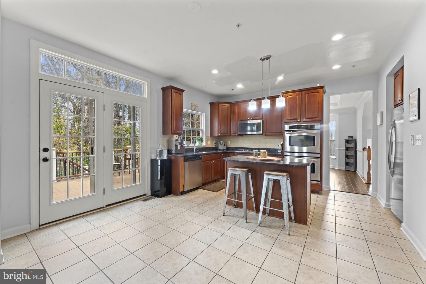 The spacious kitchen offers granite countertops, a large island with seating, stainless steel appliances including a gas cooktop, double ovens, built-in microwave, and a darling pantry. French doors open to a large deck overlooking the tree-lined backyard. The open-concept kitchen–family room features impressive 9' ceilings. The main level also includes an office/flex room, a formal dining room, and elegant trim work throughout—chair rail, crown molding, tall baseboards, and custom window trim.