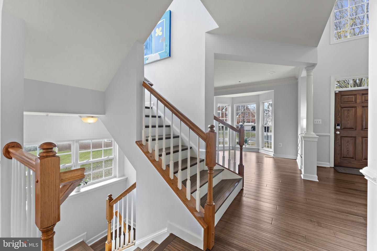 Brick-front colonial on a ¼-acre cul-de-sac lot featuring a grand two-story foyer and an open staircase with an upper-level overlook. Sunlight floods the home through multiple bay windows, floor-to-ceiling windows with transoms, and additional windows on both stair landings and in the foyer with an arched transom.