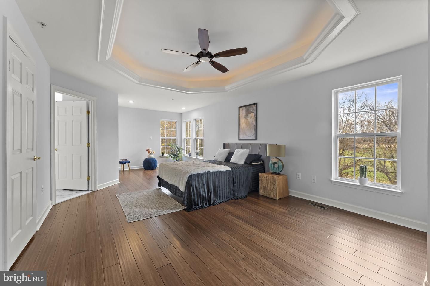 The primary bedroom suite is expansive and features a tray ceiling, beautiful dark engineered wood floors, two large walk-in closets, and a stunning spa-like bathroom with soaking tub and separate shower. The upper level continues with rich, dark, high-quality engineered flooring and offers three additional generously sized bedrooms served by a hall bath with beautiful Italian tile work and double sinks. This is a very clean, impeccably maintained home.