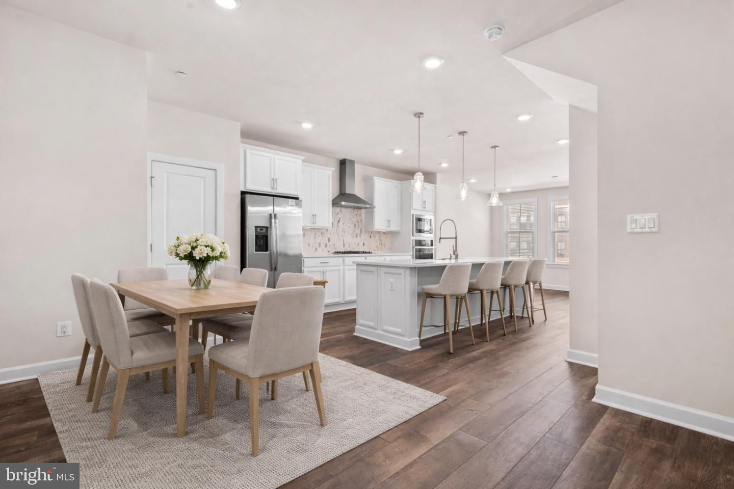 The main living level showcases an open-concept layout designed for both entertaining and daily living. The designer kitchen features a large center island, quartz countertops, tall white cabinetry with crown molding, stainless steel appliances including double wall ovens and a gas cooktop, a modern backsplash, and a farmhouse sink. The kitchen flows seamlessly into the spacious dining and living areas, creating a bright and inviting gathering space. A covered balcony just off the main level provides a comfortable outdoor extension of the living space.
