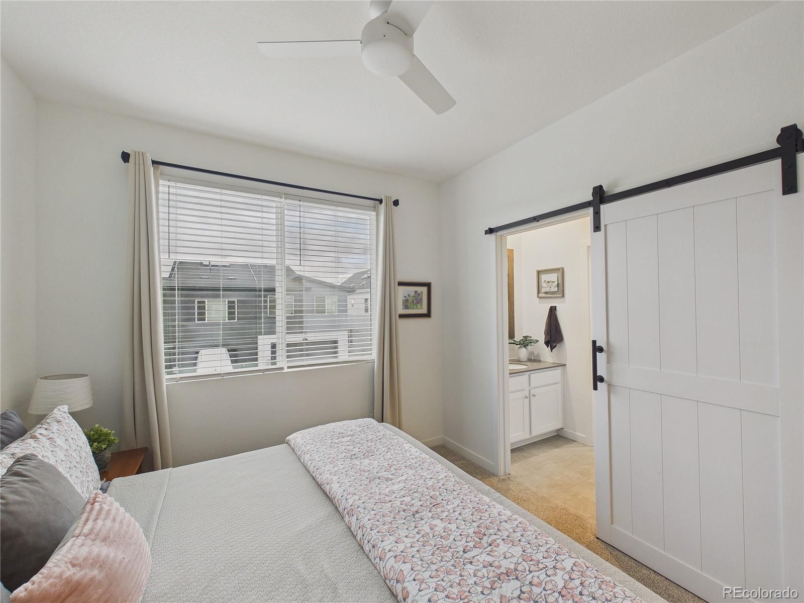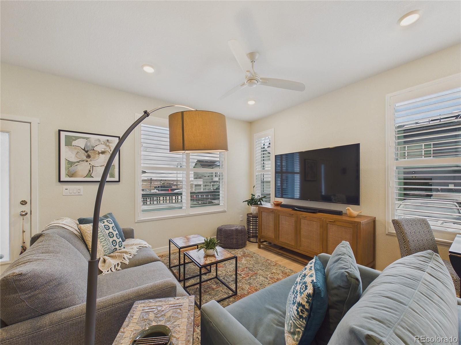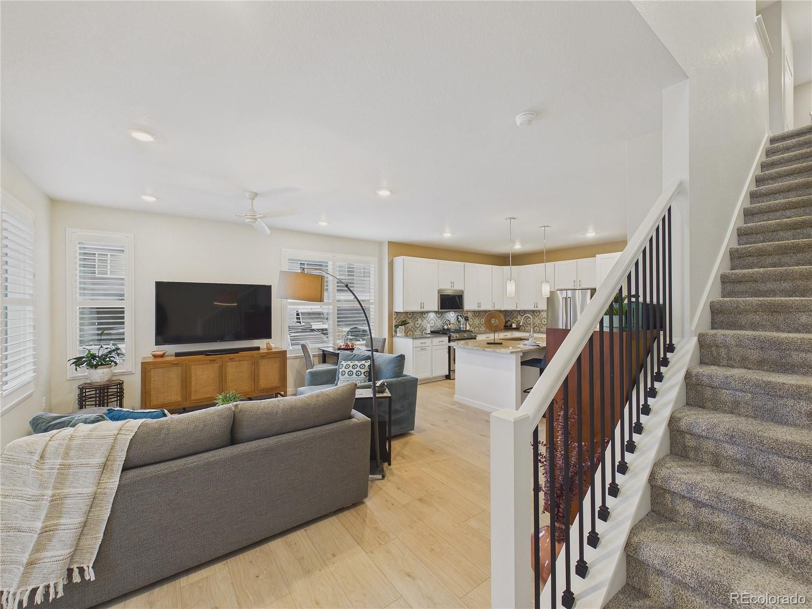 Welcome to this upgraded end-unit townhome in Whisper Village, where thoughtful updates, natural light & open-space views come together for elevated everyday living. With only one shared wall, this home offers added privacy along with sweeping views of the mountains & nearby open space from the inviting front porch. Step inside to a bright main level featuring luxury vinyl plank flooring & a seamless flow between the living & kitchen areas. The living room is equipped with a built-in TV mount & discreet cord management system for a clean, modern look. The kitchen has been extensively enhanced with abundant cabinetry, granite countertops, an extended island with an upgraded sink & bar seating—perfect for casual meals or entertaining. All appliances are new, including a gas range with a dedicated gas line. A convenient powder bath completes the main level. Upstairs, new carpet & padding on the stairs & throughout the upper level add comfort and freshness. The spacious primary suite features a walk-in closet with custom enhancements & a stylish barn door entry. The en suite bath includes dual sinks, slab quartz countertops & a new Euro-glass shower enclosure for a refined finish. Two additional bedrooms share a full Jack-and-Jill bathroom, each with its own barn door. An upstairs laundry room adds everyday convenience. Additional highlights include a new storm door, solar panels for energy efficiency & a two-car garage with recently coated & sealed flooring, overhead storage shelving & pre-wiring for a future electric vehicle charging station. Enjoy low-maintenance living with HOA-covered exterior maintenance & grounds care, giving you more time to explore the nearby recreation at Standley Lake, along with convenient access to shopping & dining. This is a rare opportunity to own a light-filled, move-in-ready home in one of Arvada’s desirable communities, combining modern upgrades, smart technology & an exceptional location!
