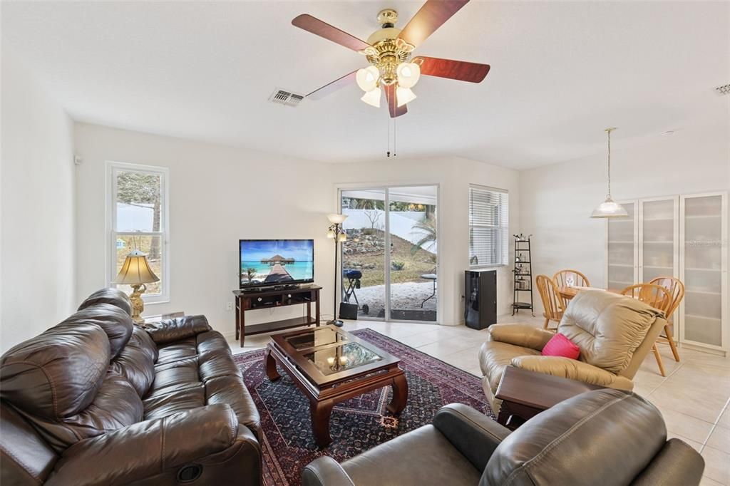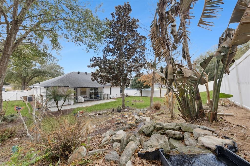 YOUR PRIVATE BOTANICAL RETREAT: The backyard is a true sanctuary, fully enclosed by a 6-ft vinyl privacy fence with double-gate access. The lush grounds feature mature Oak trees, White Birds of Paradise, and Sable and Robellini Palms, all maintained under a professional quarterly fertilization and pest plan. The centerpiece is a custom water garden built by Florida Outdoor Water Gardens, featuring authentic Tennessee River Rocks and a serene waterfall. Relax on the partially covered lanai or the large paver patio while enjoying the peace of a home that has been termite-bonded since 2003, with a new 21-station underground protection system installed in 2024.