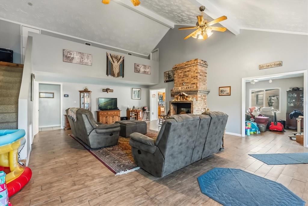 Inside, the expansive living room makes a statement with a brick fireplace and hearth, vaulted ceilings with exposed beams, and seamless flow into the adjacent dining area and well-appointed kitchen with stainless steel appliances. With six bedrooms and three bathrooms, this is one of the largest homes on the block and features a desirable double-primary suite layout, ideal for multigenerational living or added privacy. No carpet throughout ensures easy maintenance.