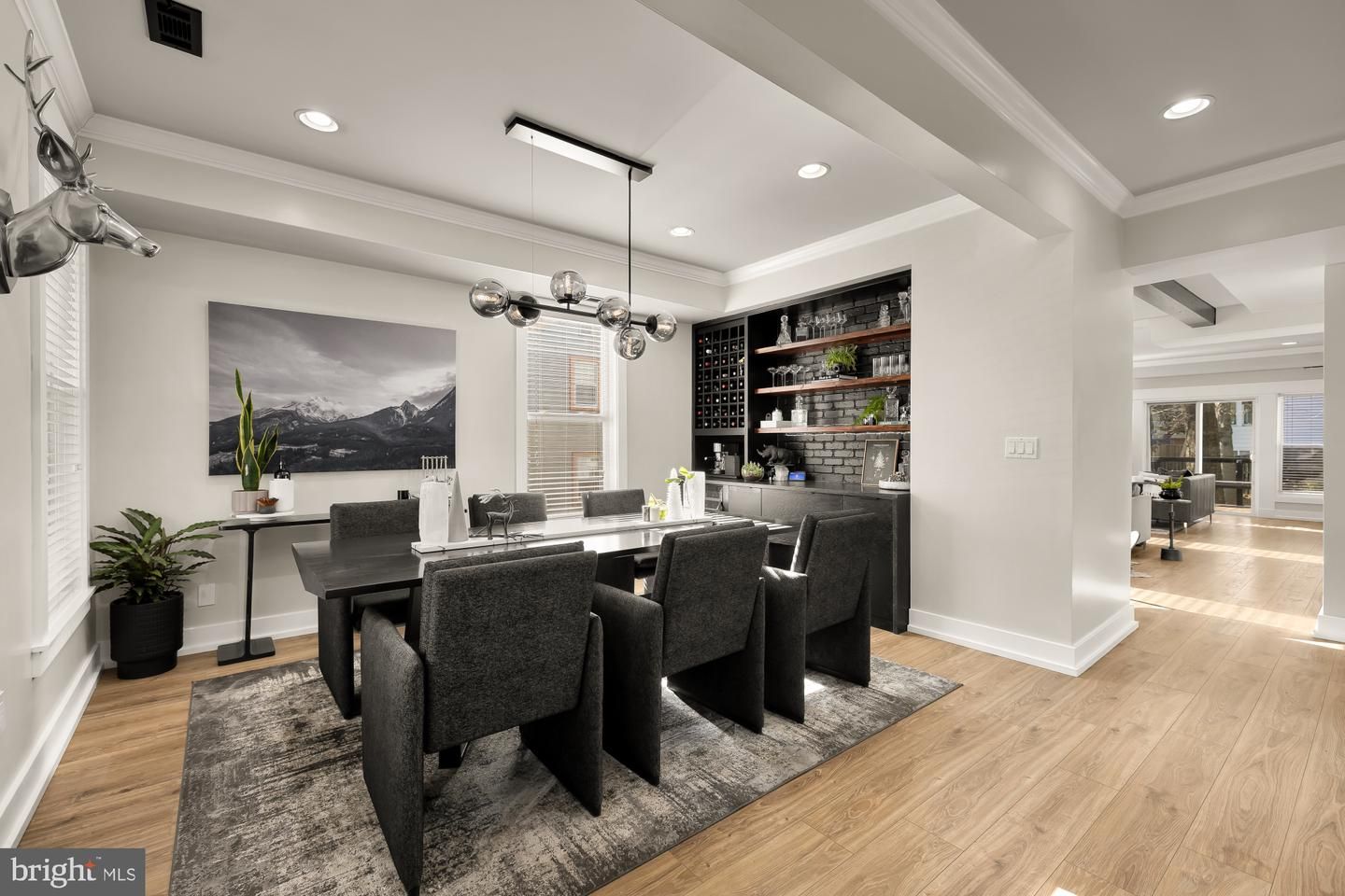 Upon entry, you are welcomed into a large dining room featuring a sleek, moody dry bar—perfect for intimate dinners or elegant entertaining. The space flows seamlessly into a spacious living room with multiple seating areas and a cozy fireplace, creating an inviting yet refined atmosphere. The living room opens to the beautifully appointed kitchen, complete with white cabinetry, granite countertops, stainless steel appliances, and a separate pantry. Bathed in natural light, the open-concept layout is both functional and stylish.