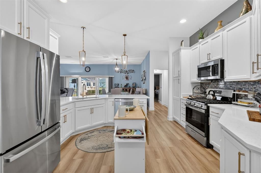 As you walk into this sanctuary of a home you will see a thoughtfully designed living space that offers an open concept attracting the natural lighting and presenting a functional space for entertaining and relaxing. This 3-bedroom, 2-bath masterpiece is Lake Denham's Spoonbill Model, which was built in 2023 and offers 2,048 of climate controlled square footage. The total square footage is approximately 3,278, including the garage, lanai, and front entry. Along with the welcoming curb appeal, this home has St. Augustine grass, a full irrigation system, and gutters surrounding the home. Inside you will walk into an entreating foyer, a chef's dream of a kitchen with all stainless-steel appliances, gas range, ample cabinetry, backsplash, and an high-top quartz countertop, perfect for decorative barstools. The living area gives a warm down-home feeling which is adjacent to the spacious dining area that is positioned perfectly for entertaining many or just a small quiet dinner with family.