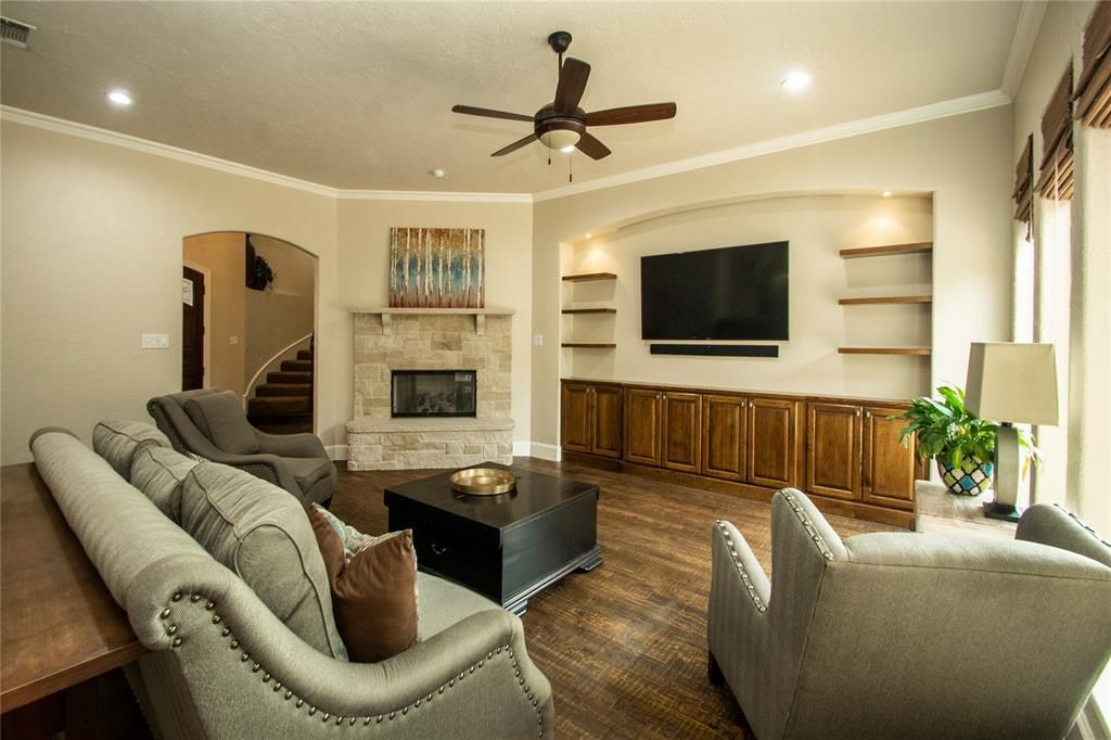 UPDATED and BEAUTIFUL!! SOARING ENTRY gives way to JULIETTE Balcony. OPEN FLOORPLAN is bright and flowing. UPDATED KITCHEN, large island with seating. Hand Scraped Hard Wood Floors throughout 1st floor, into 2nd bedroom and Mstr Suite. Mstr Retreat has separate HVAC. UPDATED Master bath has freestanding LUXURY tub. Huge WALK IN SHOWER and his and her vanities. Private hallway to 2nd bedroom and bathroom downstairs. Georgous WINDING STAIRCASE flows to 2nd story. LARGE GAME ROOM with office nook with built in Desk. 2 bedrooms up have separate vanities and walk in closets. OUTDOOR LIVING AREA with Entertainment wiring. GATED DRIVEWAY and PRIVACY FENCE for security and privacy. This is a MUST SEE on your list.