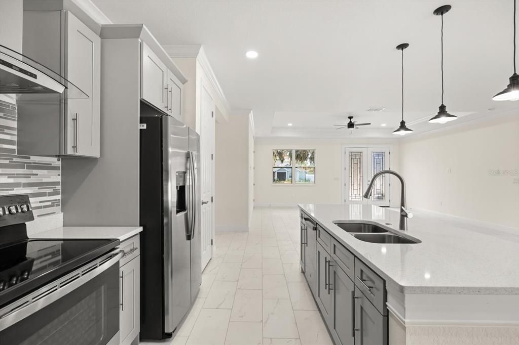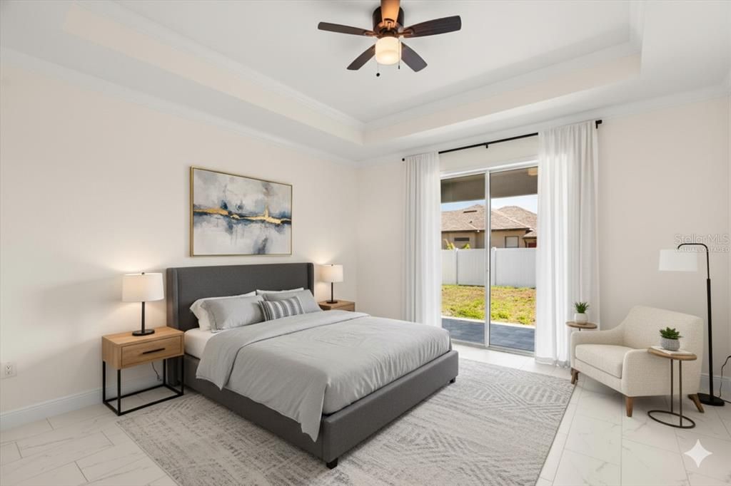 Welcome to 840 Oaks Shores Rd-a move-in ready retreat in a quiet, gated community where life slows down and the lake lifestyle speeds up. With private access to Lake Griffin, your weekends can be filled with boating, fishing, and sunset cruises-while everyday life feels like a vacation surrounded by Central Florida's natural beauty. Inside, enjoy a light, open layout made for connection and entertaining, featuring an open-concept kitchen with quartz countertops, 42" stylish gray custom cabinetry, and stainless steel appliances, flowing seamlessly into the living/dining combo. Thoughtful upgrades like ceramic tile throughout for easy maintenance, tray ceilings, and crown molding add comfort and polish. Step out to the covered lanai-perfect for morning coffee, evening wind-downs, and hosting friends. Situated on a spacious corner lot, there's plenty of outdoor room to play, garden, or create your dream backyard oasis. Enjoy the best of both worlds: peaceful, scenic living with convenient access to shopping, dining, parks, and all that the Leesburg lakefront area has to offer.