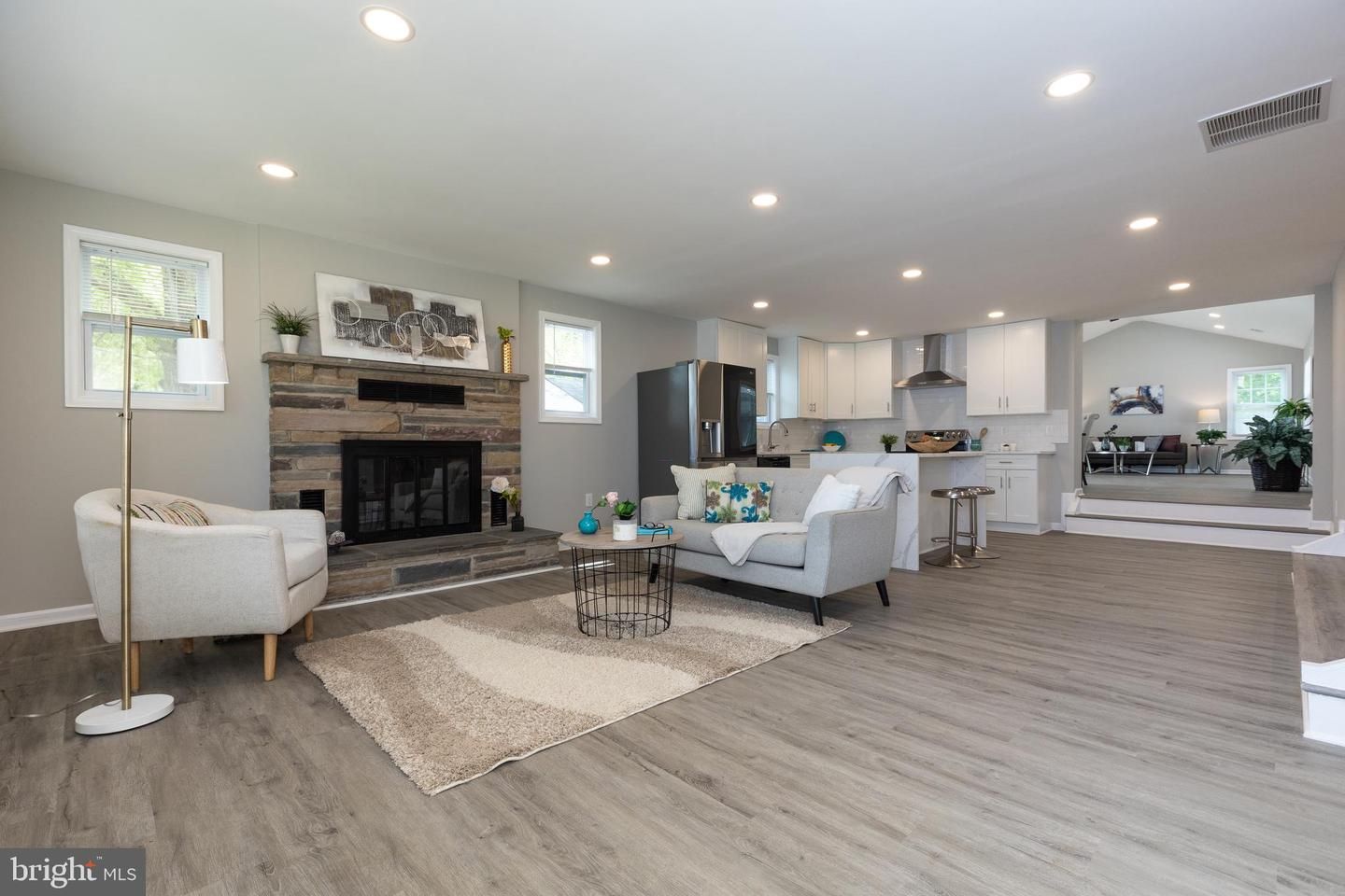 Step inside to an open, modern floor plan where the living room, complete with a cozy fireplace, flows seamlessly into a beautifully upgraded kitchen. The kitchen is a chef's dream, The kitchen features brand-new cabinets, quartz countertops, a large island, and upgraded stainless steel appliances—perfect for entertaining and everyday living.
