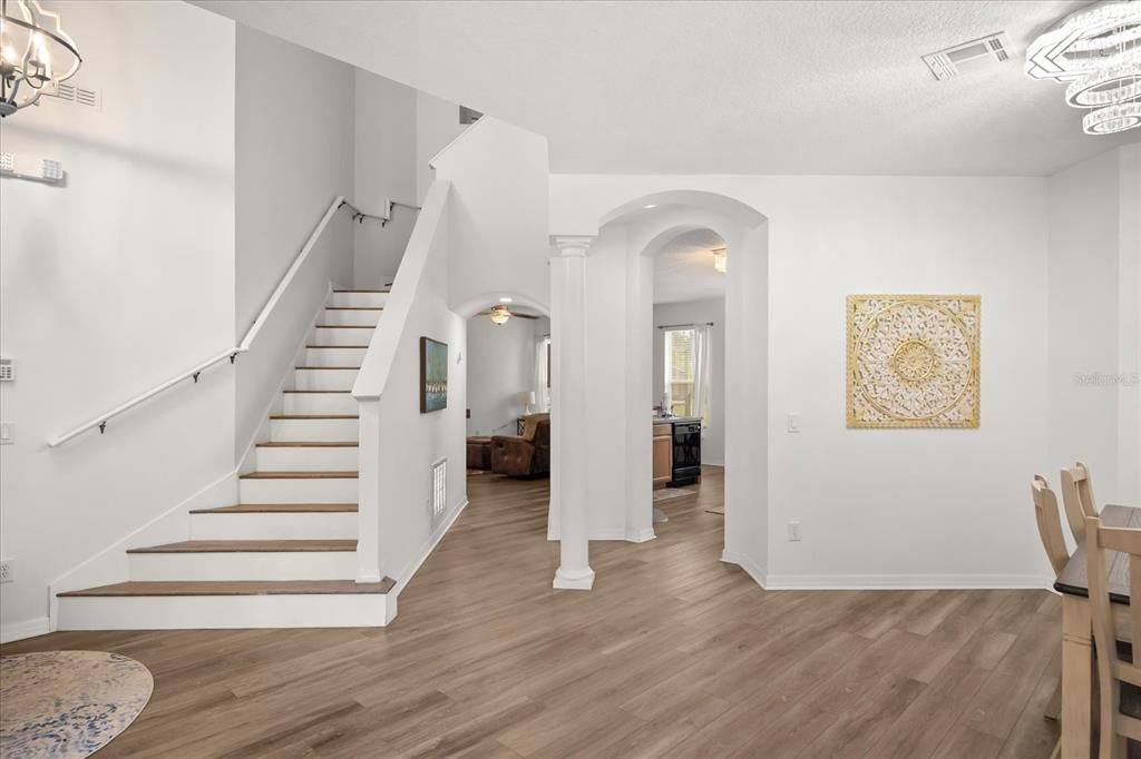 Inside, the open floor plan features NEW waterproof laminate flooring, modern fans and fixtures, NEW lighting, and abundant natural light throughout. The kitchen boasts upgraded light fixtures, an island, and excellent workspace-perfect for everyday living and entertaining. A spacious primary suite on the ground floor offers a spa-like ensuite bath and a generous walk-in closet for added convenience and privacy.